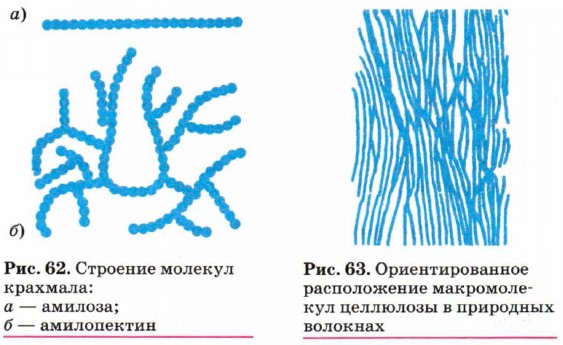 Однако эти углеводы различаются не только молекулярной массой, но и структурой. Для макромолекул крахмала характерны два вида структуры: линейная и разветвлённая. Линейную структуру имеют более мелкие макромолекулы той части крахмала, которую называют амилозой, а разветвлённую структуру имеют молекулы другой составной части крахмала — амилопектина (рис. 62). В крахмале на долю амилозы приходится 10—20%, а на долю амилопектина — 80—90% . Амилоза крахмала в горячей воде растворяется, а амилопектин только набухает. Структурные звенья крахмала и целлюлозы построены по-разному. Если звено крахмала включает остатки α-глюкозы, то целлюлоза — остатки β-глюкозы, ориентированные в природные волокна (рис. 63).