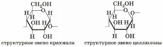 Глава 5. Углеводы Дисахариды. Сахароза. Полисахариды. Крахмал и целлюлозаФизические свойства и нахождение в природе полисахаридовКрахмал — белый аморфный порошок, не растворяется в холодной воде. В горячей воде он разбухает и образует коллоидный раствор — крахмальный клейстер. Крахмал содержится в цитоплазме растительных клеток в виде зёрен запасного питательного вещества. В картофельных клубнях содержится около 20% крахмала, в пшеничных и кукурузных зёрнах — около 70%, а в рисовых — почти 80% . Целлюлоза (от лат. cellula — клетка), выделенная из природных материалов, представляет собой твёрдое волокнистое вещество, нерастворимое в воде. Хотя оба полисахарида имеют растительное происхождение, однако играют в клетках растений разную роль: целлюлоза — строительный, конструкционный материал. Поэтому целлюлоза — обязательный элемент клеточной оболочки растений. Волокна хлопка содержат до 95% целлюлозы, волокна льна и конопли — до 80%, а в древесине её содержится около 50%. Строение крахмала и целлюлозыСостав этих полисахаридов, как вы уже знаете, можно выразить общей формулой (С6Н10О5)n. Число повторяющихся звеньев в макромолекуле крахмала может колебаться от нескольких сотен до нескольких тысяч. Целлюлоза же отличается значительно большим числом звеньев и, следовательно, молекулярной массой, которая достигает нескольких миллионов.
