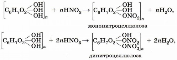 В пищеварительном тракте животных крахмал подвергается сложному ступенчатому гидролизу: крахмал → декстрины → мальтоза → глюкоза. Организм человека не приспособлен к перевариванию целлюлозы, так как не имеет ферментов, необходимых для разрыва связей между остатками β-глюкозы в её макромолекуле. Лишь у термитов и жвачных животных (например, коров) в пищеварительной системе живут микроорганизмы, вырабатывающие необходимые для этого ферменты. Образование сложных эфиров. Крахмал может образовывать эфиры за счёт гидроксигрупп, однако эти эфиры не нашли практического применения. Другое дело целлюлоза. Проанализируйте состав структурного звена целлюлозы, и вы увидите, что каждое звено содержит три свободные спиртовые гидроксигруппы. Поэтому общую формулу целлюлозы можно записать и таким образом: [С 6 Н 7 O 2 (OН) 3 ] n . За счёт этих спиртовых гидроксигрупп целлюлоза и может образовывать сложные эфиры, которые широко применяются. При обработке целлюлозы смесью азотной и серной кислот получают в зависимости от условий моно-, ди- и тринитраты целлюлозы: