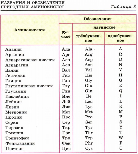 В живых организмах в биосинтезе белка участвуют20 аминокислот, для которых применяют чаще исторические названия. Эти названия и принятые для них русские и латинские буквенные обозначения приведены в таблице 8.
