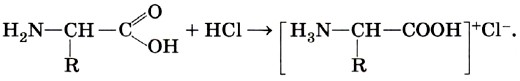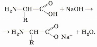 Смесь аминокислот обычно получают кислотным гидролизом белков. Свойства аминокислотАминогруппа —NH2 определяет основные свойства аминокислот, так как способна присоединять к себе катион водорода по донорно-акцепторному механизму за счёт наличия свободной электронной пары у атома азота. Карбоксильная группа —СООН определяет кислотные свойства этих соединений. Следовательно, аминокислоты — это амфотерные органические вещества. С щелочами они реагируют как кислоты: