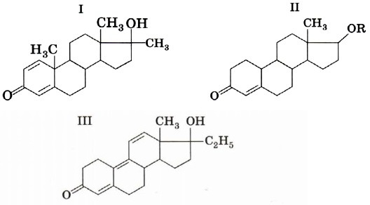 1. Предварительно проконсультировавшись у своего учителя биологии и школьного врача, подготовьте небольшое сообщение об основных средствах и методах профилактики сахарного диабета. Перескажите основные идеи своего сообщения родным и близким. 2. Каким физиологическим процессам соответствует возникновение адреналиновой гипергликемии? В каких органах и тканях протекают эти процессы? Составьте уравнение гидролиза гликогена и объясните связь этой реакции с адреналиновой гипергликемией. 3. Опишите процессы, на которые оказывают влияние инсулин и адреналин. Можно ли считать эти гормоны антагонистами? 4. Назовите железы внутренней секреции и вырабатывае- мые ими гормоны. 5. Какие процессы регулирует гидрокортизон? Что общего в физиологическом действии этого гормона и адреналина? В чём отличия их влияния на организм? Приведите уравнения реакций, соответствующих биохимическим процессам, на которые влияют эти гормоны. 6. К каким негативным последствиям может привести непрерывное продолжительное повышенное содержание адреналина в крови? 7. К каким классам веществ можно отнести тестостерон и эстрадиол? Почему отличаются суффиксы их названий? 8. Анаболики — синтетические лекарственные препараты, которые стимулируют синтез белка и кальцификацию костной ткани. Их действие проявляется в увеличении массы скелета и скелетной мускулатуры. Сравните состав и строение метандростенолона — дианабола (формула I), феноболина — дураболина (II, R—C(O)CH2CH2Ph), ретаболила (II, R—СО(СН2)8(СН3)) и трианабола (III).