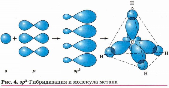 Связи, отражённые этими чёрточками, ковалентные, но разные по способу перекрывания: одна из них σ, другая — π. В молекуле этилена каждый атом углерода соединён не с четырьмя, а с тремя другими атомами (с одним атомом углерода и двумя атомами водорода), поэтому в гибридизацию вступают только три электронные орбитали: одна s и две р, т. е. происходит sр2-гибридизация. Оси трёх гибридных орбиталей располагаются в одной плоскости под углом 120° по отношению друг к другу. Орбитали каждого атома углерода перекрываются с s-орбиталями двух атомов водорода и с одной такой же sр2-гибридной орбиталью соседнего атома углерода и образуют три σ-связи под углом 120°. Следовательно, молекула этилена будет иметь плоскостное строение. Две р-орбитали атомов углерода, которые не участвуют в гибридизации, будут перекрываться в двух областях, перпендикулярных плоскости молекулы («боковое» перекрывание), и образуют π-связь (рис. 5).