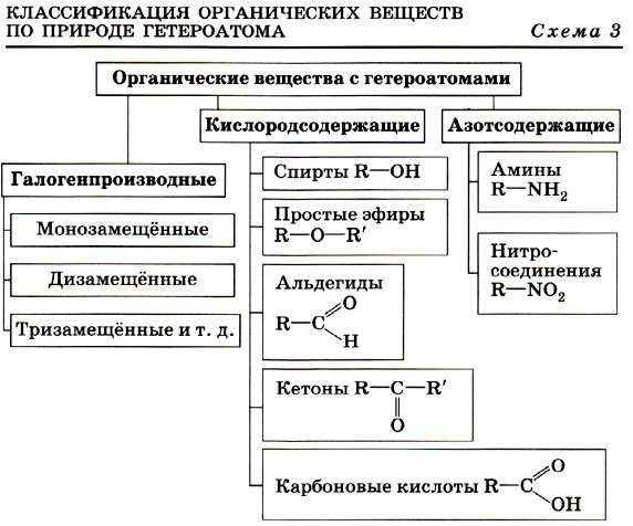 Циклические углеводороды, содержащие в молекуле цикл из шести атомов углерода с чередующимися двойными и одинарными связями (так называемую систему сопряжённых π-связей), называются аренами. Их относят также к группе ароматических соединений. Вы уже знаете, что помимо углерода и водорода в состав органических соединений могут входить атомы других элементов, в первую очередь кислорода, азота, галогенов. Классификация органических соединений в зависимости от природы гетероатома приведена на схеме 3.