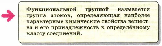 Кислород в органических веществах, в отличие от водорода и галогенов, всегда двухвалентен, следовательно, образует две химические связи с другими атомами. Валентность атома азота также всегда больше единицы. Именно поэтому кислород и азот входят в состав органических веществ не как отдельные атомы, а в виде группы атомов. Такая группа называется функциональной. Именно она определяет важнейшие физические и химические свойства вещества в целом, а также его принадлежность к тому или иному классу веществ.