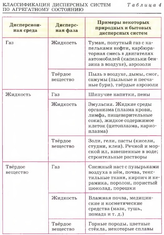 То вещество, которое присутствует в дисперсной системе в меньшем количестве и распределено в объёме другого, называют дисперсной фазой. Она может состоять из нескольких веществ. Вещество, присутствующее в дисперсной системе в большем количестве, в объёме которого распределена дисперсная фаза, называют дисперсионной средой. Между дисперсионной средой и частицами дисперсной фазы существует поверхность раздела, поэтому дисперсные системы называют гетерогенными, т. е. неоднородными. И дисперсионная среда, и дисперсная фаза могут находиться в различных агрегатных состояниях. В зависимости от сочетания дисперсионной среды и дисперсной фазы можно выделить 8 видов таких систем (табл. 4). По величине частиц вещества, составляющих дисперсную фазу, дисперсные системы делят на грубодисперсные с размерами частиц более 100 нм и тонкодисперсные с размерами частиц от 100 до 1 нм. Если же вещество раздроблено до молекул или ионов размером менее 1 нм, образуется гомогенная система — раствор. Она однородна, поверхности раздела между частицами и средой нет, а потому к дисперсным системам не относится. Знакомство с дисперсными системами и растворами показывает, насколько они важны в повседневной жизни и природе.