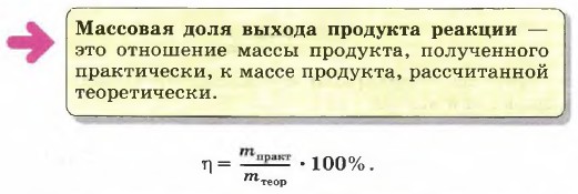 Глава первая. Углеводороды и их природные источники § 12. Состав вещества. Смеси (окончание)Разновидностью понятия «доля» в химии является массовая доля выхода продукта реакции.