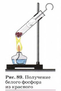 Исторически первым было осуществлено превращение белого фосфора в красный, когда немецкий алхимик X. Брандт в 1669 г., пытаясь получить так называемый философский камень прокаливанием сухого остатка мочи, получил светящиеся белые кристаллики вещества, названного им фосфором (от греч. «несущий свет»). Получить из красного фосфора белый можно и в школьной лаборатории (рис. 89).