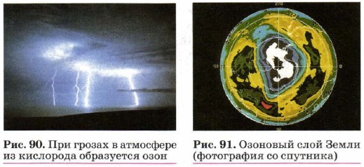 стало причиной гибели экспедиции Р. Скотта, пытавшегося в 1912 г. покорить Южный полюс. Экспедиция Р. Скотта использовала для хранения продуктов и керосина железные канистры, запаянные оловом. На сильном морозе оловянный припой рассыпался, и экспедиция осталась без топлива. Для многих других химических элементов также характерно явление аллотропии. Так, кислород образует две модификации — кислород O2 и озон O3. Превращение кислорода в озон происходит в природе при грозах (рис. 90). Впечатлённые этими природными явлениями поэты нередко допускают химические неточности типа: «В воздухе пахло грозой». А пахнет-то не грозой, а образующимся в результате её озоном (в переводе с греческого «озон» и означает «пахнущий»). О биологической роли защитного озонового экрана Земли вы уже знаете. Перед человечеством стоит насущная задача сохранить этот жизнеобеспечивающий экран от разрушения, так как с космических спутников приходят тревожные факты об уменьшении толщины озонового слоя атмосферы — так называемых озоновых дырах, которые на рисунке 91 показаны белым цветом.