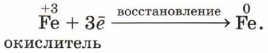 Элементы или вещества, отдающие электроны, называют восстановителями. В ходе реакции они окисляются. Условный ион железа в степени окисления +3 получил три электрона и превратился в нейтральный атом: