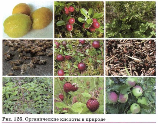 Глава третья. Вещества и их свойства § 22. КислотыЭтот класс соединений (дайте его определения с точки зрения состава и продуктов диссоциации) широко распространён в природе. В желудке человека содержится сильная бескислородная одноосновная кислота — соляная. Это своеобразный санитарный кордон для микробов, которые попадают в желудок вместе с пищей. Соляная кислота желудка создаёт благоприятную среду для работы фермента желудочного сока пепсина, который расщепляет сложные белки до более простых. Следовательно, соляная кислота — необходимое для пищеварения вещество. При недостаточной кислотности желудочного сока больным предписывают принимать аптечные препараты, содержащие соляную кислоту. Однако и избыток соляной кислоты в желудке грозит дискомфортом, который известен под названием изжога. В этом случае нередко избыток кислоты гасится с помощью минеральных карбонатных и гидрокарбонатных вод. В природе наблюдается многообразие органических кислот (рис. 126): лимонная кислота содержится в лимонах, яблочная — в яблоках, щавелевая — в листьях щавеля. Муравьи защищаются от врагов, разбрызгивая жидкость, содержащую муравьиную кислоту. Эта кислота содержится в пчелином яде и в жгучих волосках крапивы. Помогает сохранять свежими ягоды клюквы или брусники в течение многих месяцев содержащаяся в них бензойная кислота. При скисании виноградного сока получается уксусная кислота, а при скисании молока, при квашении капусты и при силосовании кормов для скота — молочная кислота (рис. 127). Кислоты можно классифицировать по различным признакам (табл. 6). Кислый вкус, действие на индикаторы, электрическая проводимость растворов, взаимодействие с металлами, основными и амфотерными оксидами, основаниями и солями, образование сложных эфиров со спиртами — все эти свойства являются общими как для неорганических, так и для органических кислот.