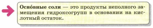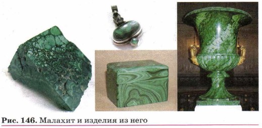 В отличие от кислых солей, почти все осно́вные соли в воде нерастворимы. Осно́вной солью является гидроксокарбонат меди (II) (СиОН)2СO3, более известный под названием «малахит» — красивейший минерал изумительного зелёного цвета (рис. 146). Малахит — это неодушевлённый герой знаменитых уральских сказов П. Бажова. Вспомните хотя бы его «Малахитовую шкатулку», «Хозяйку Медной горы».