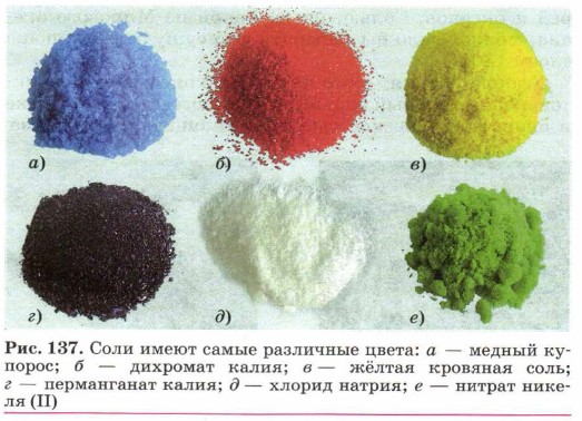 Глава третья. Вещества и их свойства § 24. СолиИз всех неорганических соединений соли являются наиболее многочисленным классом веществ. Это твёрдые вещества ионного строения, которые отличаются друг от друга по цвету (рис. 137) и растворимости (см. таблицу растворимости). В начале XIX в. шведский химик Й. Берцелиус предложил рассматривать соли как продукты реакции кислот с основаниями или как соединения, полученные замещением атомов водорода в кислоте на металл. По этому признаку различают средние, кислые и основные соли.