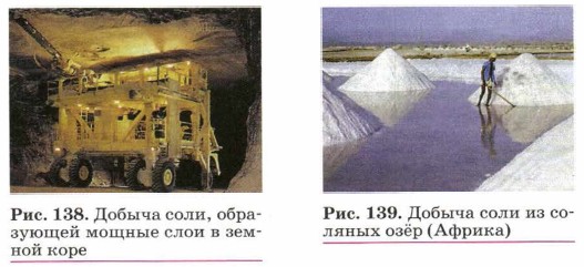 Необходимость соли для жизни человека была известна с глубочайшей древности. Значение соли отражено в многочисленных пословицах, поговорках, обычаях. «Хлеб да соль» — вот одно из пожеланий, которым русские люди с давних пор обменивались друг с другом во время приёма пищи, подчёркивая равноценное с хлебом значение соли. Хлеб и соль стали символом гостеприимства и радушия русской нации. Соль образует мощные отложения (рис. 138). В Соль-Илецке, например, толщина пласта соли превышает 1,5 км. Соли, находящейся в озере Баскунчак в Астраханской области, хватит нашей стране на 400 лет. В Африке основную массу соли добывают из соляных озёр (рис. 139).
