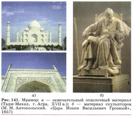 Огромные количества соли содержат в себе воды морей и океанов. Солью, извлечённой из Мирового океана, можно было бы засыпать всю сушу земного шара слоем 130 м. Хлорид натрия — это не только консервант продуктов и обязательный атрибут обеденного стола, но также и ценное химическое сырьё. С помощью электролиза расплава или раствора хлорида натрия получают нужные для неорганического синтеза вещества (вспомните какие). Карбонат кальция СаСO3 — это не только меловые или известковые горы (рис. 140), но также замечательный отделочный материал — мрамор (рис. 141, а), который является материалом скульпторов (рис. 141, б). Геологи называют этот минерал кальцитом.