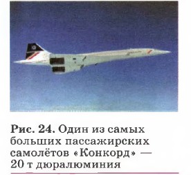 Ещё в глубокой древности люди заметили, что металлические сплавы обладают другими, нередко более полезными свойствами, чем составляющие их чистые металлы. Например, у первого полученного человеком сплава — бронзы прочность выше, чем у составляющих её меди и олова. Сталь и чугун прочнее чистого железа. Чистый алюминий — очень мягкий металл, сравнительно непрочный на разрыв. Но сплав, состоящий из алюминия, магния, марганца, меди, никеля, называемый дюралюминием, в 4 раза прочнее алюминия на разрыв и используется в самолётостроении (рис. 24), а потому образно называется «крылатым» металлом. Чистые металлы используют очень редко. Чаще применяют их сплавы. Из чуть более 80 известных металлов созданы десятки тысяч различных сплавов.