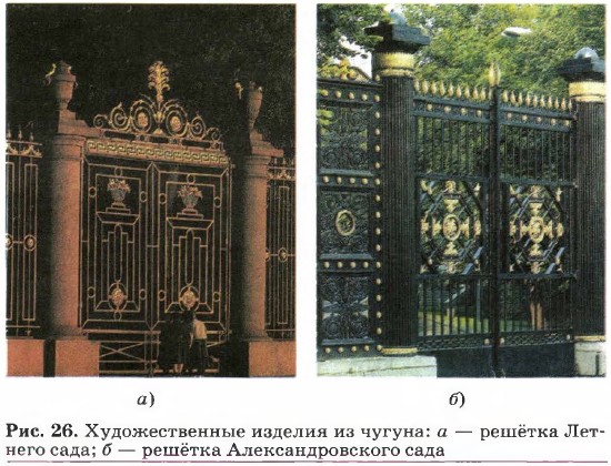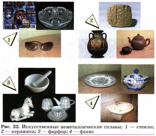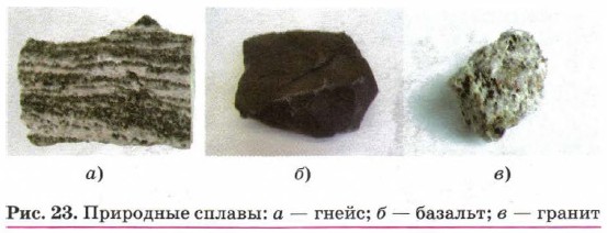 Большинство металлов имеют серебристо-белый цвет. Золото окрашено в жёлтый (червонный) цвет, а медь — в красно-жёлтый (медный). На рисунке 21 представлены причудливые самородки металлов, имеющие соответствующую окраску. Металлическая химическая связь и металлическая кристаллическая решётка характерны не только для чистых металлов, но и для их сплавов. Это отличает металлические сплавы от других сплавов, как искусственных (стекло, керамика, фарфор, фаянс (рис. 22)), так и природных (гнейс, базальт, гранит (рис. 23)).