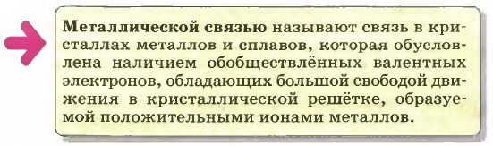 То же самое наблюдается и в металлических сплавах. Металлическая связь неразрывно связана с особым кристаллическим строением металлов и сплавов — металлической кристаллической решёткой, в узлах которой расположены положительно заряженные ионы.