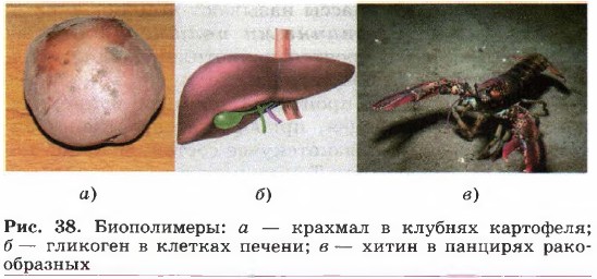 Помимо белков и нуклеиновых кислот, к биополимерам, т. е. природным полимерам, относятся знакомые вам полисахариды — крахмал, целлюлоза, гликоген, хитин и др. (рис. 38).