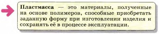 Как правило, пластмасса — это смесь нескольких веществ, а полимер — это лишь одно из них, но самое важное. Он связывает все компоненты пластмассы в единое целое. Поэтому полимер называют связующим. Первые пластмассы, как мы уже подчёркивали, были искусственными полимерами, а затем в качестве связующих стали применять и синтетические полимеры: фенолоформальдегидные смолы, полиэфиры и т. д. Понятно, что превращать в готовые изделия удобно те пластмассы, которые обратимо твердеют и размягчаются. Такие пластмассы называют термопластами или термопластичными полимерами. К таким пластмассам относятся полиэтилен, полистирол, поливинилхлорид, полиамиды. Если же в процессе формования изделия происходит сшивка макромолекул и полимер, твердея, приобретает пространственную структуру, то в вязкотекучее состояние такой полимер вернуть нельзя. Такие пластмассы называют термореактопластами или термореактивными полимерами (например, фенолоформальдегидные, карбамидные и полиэфирные). Кроме связующего (полимера) в пластмассы часто вводят разные добавки: наполнители, красители, а также вещества, повышающие механические свойства, термостойкость и устойчивость к старению. Наполнители не только значительно удешевляют пластмассы, но и придают им многие специфические свойства. Так, пластмассы с наполнителем в виде алмазной и карборундовой пыли — это абразивы, т. е. шлифовальный материал. Широкому применению пластмасс способствует их низкая стоимость, лёгкость переработки. По свойствам пластмассы часто не уступают металлам и сплавам, а иногда даже превосходят их.