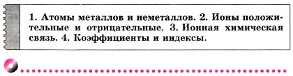 Для выражения состава ионных соединений пользуются формульными единицами — аналогами молекулярных формул. Цифры, показывающие число атомов, молекул или формульных единиц, называют коэффициентами, а цифры, показывающие число атомов в молекуле или ионов в формульной единице, называют индексами. В первой части параграфа мы сделали вывод о характере и причинах изменения свойств элементов. Во второй части параграфа приведём ключевые слова.
