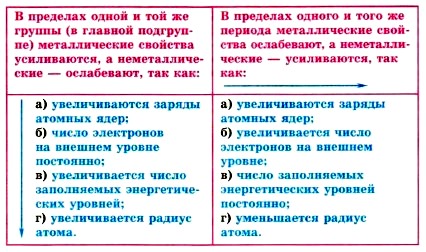 Глава первая. Атомы химических элементов § 10. Изменение числа электронов на внешнем энергетическом уровне атомов химических элементовКаждый период Периодической системы Д. И. Менделеева заканчивается инертным, или благородным, газом. Самым распространённым из инертных (благородных) газов в атмосфере Земли является аргон, который удалось выделить в чистом виде раньше других аналогов. В чём причина инертности гелия, неона, аргона, криптона, ксенона и радона? В том, что у атомов инертных газов на внешних, самых удалённых от ядра уровнях находится восемь электронов (у гелия — два). Восемь электронов на внешнем уровне — предельное число для каждого элемента Периодической системы Д. И. Менделеева, кроме водорода и гелия. Это своеобразный идеал прочности энергетического уровня, к которому стремятся атомы всех остальных элементов Периодической системы Д. И. Менделеева. Добиваться такого положения электронов атомы могут двумя путями: отдавая электроны с внешнего уровня (в этом случае внешний незавершённый уровень исчезает, а предпоследний, который был завершён в предыдущем периоде, становится внешним) или принимая электроны, которых не хватает до заветной восьмёрки. Атомы, имеющие на внешнем уровне меньшее число электронов, отдают их атомам, у которых на внешнем уровне больше электронов. Легко отдать один электрон, когда он единственный на внешнем уровне, атомам элементов главной подгруппы I группы (IA группы). Труднее отдавать два электрона, например, атомам элементов главной подгруппы II группы (IIA группы). Ещё труднее отдавать свои три внешних электрона атомам элементов III группы (IIIA группы). Тенденцию к отдаче электронов с внешнего уровня имеют атомы элементов-металлов. И чем легче атомы элемента-металла отдают свои внешние электроны, тем в большей степени выражены у него металлические свойства. Понятно поэтому, что наиболее типичными металлами в Периодической системе Д. И. Менделеева являются элементы главной подгруппы I группы (IA группы). И наоборот, тенденцию к принятию недостающих до завершения внешнего энергетического уровня имеют атомы элементов-неметаллов. Из сказанного можно сделать следующий вывод. В пределах периода с увеличением заряда атомного ядра, а соответственно и с увеличением числа внешних электронов металлические свойства химических элементов ослабевают. Неметаллические свойства элементов, характеризующиеся лёгкостью принятия электронов на внешний уровень, при этом усиливаются. Наиболее типичными неметаллами являются элементы главной подгруппы VII группы (VIIA группы) Периодической системы Д. И. Менделеева. На внешнем уровне атомов этих элементов находятся семь электронов. До восьми электронов на внешнем уровне, т. е. до устойчивого состояния атомов, им не хватает по одному электрону. Они легко их присоединяют, проявляя неметаллические свойства. А как ведут себя атомы элементов главной подгруппы IV группы (IVA группы) Периодической системы Д. И. Менделеева? Ведь у них на внешнем уровне четыре электрона, и им, казалось бы, всё равно, отдать или принять четыре электрона. Выяснилось, что на способность атомов отдавать или принимать электроны оказывает влияние не только число электронов на внешнем уровне, но и радиус атома. В пределах периода число энергетических уровней у атомов элементов не изменяется, оно од