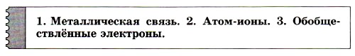 Металлическая связь характерна как для чистых металлов, так и для смесей различных металлов — сплавов, находящихся в твёрдом и жидком состояниях. Однако в парообразном состоянии атомы металлов связаны между собой ковалентной связью (например, парами натрия заполняют лампы жёлтого света для освещения улиц больших городов). Пары металлов состоят из отдельных молекул (одноатомных и двухатомных). Вопрос о химических связях — центральный вопрос науки химии. Вы познакомились с начальными представлениями о типах химической связи. В дальнейшем вы узнаете много интересного о природе химической связи. Например, что в большинстве металлов, кроме металлической связи, есть ещё и ковалентная связь, что существуют и другие типы химических связей.