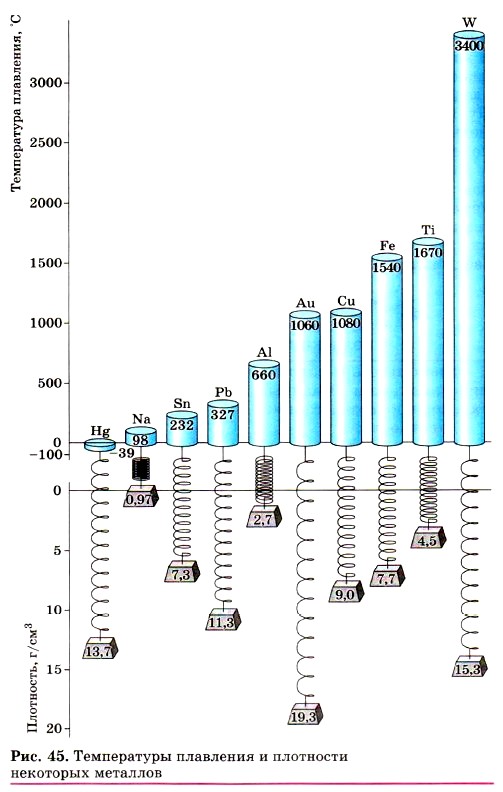 М. В. Ломоносов определял металл «как светлое тело, которое ковать можно», и относил это свойство к металлам: золоту, серебру, меди, олову, железу и свинцу. А. Лавуазье в «Начальном курсе химии», написанном в 1789 г., упоминал уже 17 металлов. В начале XIX в. последовало открытие платиновых металлов. К настоящему времени число известных металлов возросло до 92. Пластичность — это важнейшее свойство металлов изменять свою форму при ударе, прокатываться в тонкие листы и вытягиваться в проволоку. При этом подвижные обобществлённые электроны смягчают перемещение положительных ионов, экранируя их друг от друга. Поэтому обработка металлов с изменением формы происходит без разрушения. Самым пластичным из драгоценных металлов является золото. Один грамм золота можно вытянуть в проволоку длиной два километра. Все металлы, как вы знаете, твёрдые при обычных условиях вещества. Исключение, как уже отмечалось, составляет ртуть, которая при обычных условиях представляет собой жидкий блестящий серебристо-белый металл. Металлы различаются по твёрдости. Мягкие — щелочные, например, или свинец, а твёрдые — хром, титан, молибден. Представление о температурах плавления и плотности некоторых металлов вы можете получить, если внимательно рассмотрите рисунок 45.