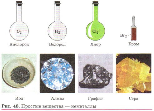 Неметаллы — простые вещества, при обычных условиях могут быть газами, жидкостями и твёрдыми веществами (рис. 46).