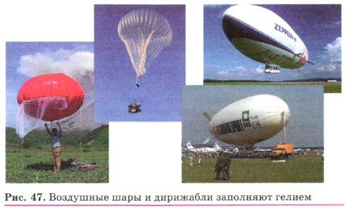 Газами являются гелий Не, неон Ne, аргон Аr, криптон Кr, ксенон Хе, радон Rn. Их называют инертными газами. Молекулы инертного газа состоят из одного атома. На внешнем электронном слое у атомов инертных газов (за исключением гелия) восемь электронов. У гелия — два. Своей химической устойчивостью инертные газы напоминают благородные металлы — золото и платину, и у них есть второе название — благородные газы. Это название более подходит к инертным газам, которые всё-таки вступают иногда в химические реакции и образуют соединения. В 1962 г. появилось сообщение о том, что получено соединение ксенона с фтором. Сейчас известно уже более 150 соединений ксенона, криптона, радона с фтором, кислородом, хлором и азотом. Представление о химической исключительности благородных газов оказалось не очень состоятельным, и потому вместо предполагаемой нулевой группы инертные газы были помещены в VIII группу (VIIIA группу) таблицы Д. И. Менделеева. Гелием, по легкости уступающим только водороду, но, в отличие от последнего, негорючим, т. е. не представляющим пожарной опасности, заполняют аэростаты и дирижабли (рис. 47).