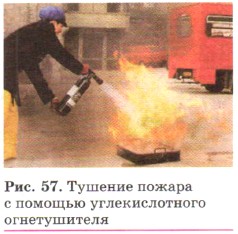 При увеличении давления до 60 атм он превращается в бесцветную жидкость. При испарении жидкого углекислого газа часть его может превратиться в твёрдую снегообразную массу. Её прессуют и получают так называемый сухой лёд, который при обычном давлении возгоняется, не плавясь, причём температура его понижается до -78,5 °С. Поэтому сухой лёд в основном применяют для хранения пищевых продуктов, и в первую очередь мороженого (рис. 55). Наиболее широко СO2 используют при изготовлении газированных напитков (рис. 56). Углекислый газ не поддерживает горения и потому применяется для тушения пожаров (рис. 57).