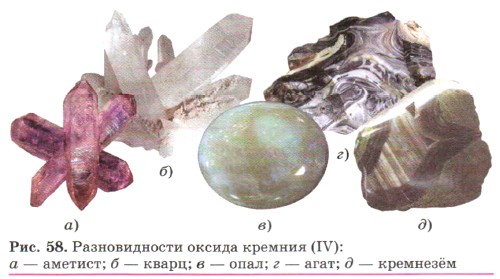которые входят в состав многих минералов и горных пород, а также образуют минералы, почти полностью состоящие из этих оксидов. Так, оксид кремния (IV) образует кварц, кварцевый песок, кремнезём, горный хрусталь и др. (рис. 58), а оксид алюминия — рубин, сапфир, основную массу особых глин — бокситов и др. (рис. 59).
