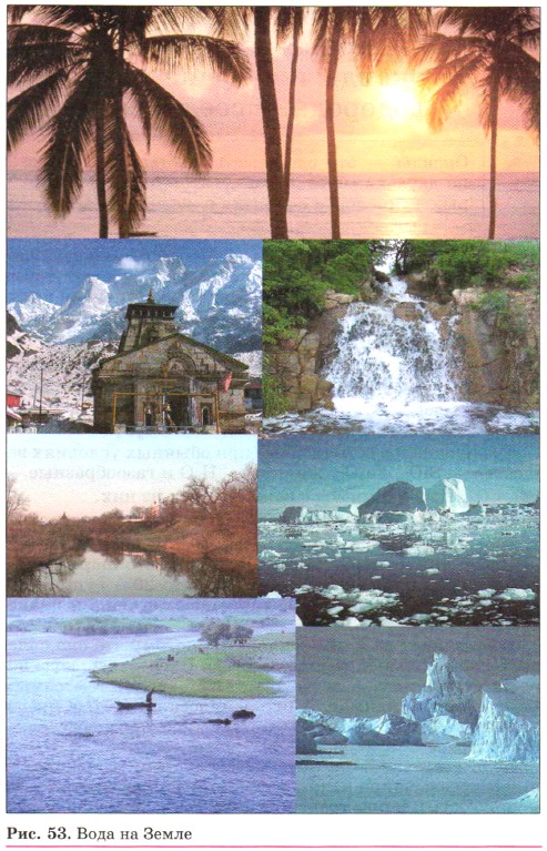 Оксиды — широко распространённый в природе класс неорганических соединений. К оксидам относят такие хорошо известные соединения, как песок (диоксид кремния SiO2 с небольшим количеством примесей), вода (оксид водорода Н2O), углекислый газ (диоксид углерода СO2), глина (оксид алюминия с небольшим количеством других соединений) и т. д. Большинство руд чёрных металлов содержат оксиды, например красный железняк — Fe2O3 и магнитный железняк — Fe3O4. Среди оксидов есть твёрдые при обычных условиях вещества — SiO2, Fe2O3, жидкие — Н2O и газообразные — СО, СO2. Познакомимся с важнейшими из них. Вода Н2O. Это самое удивительное, самое распространённое и самое необходимое вещество на нашей планете. Почти три четверти поверхности земного шара занято водой морей и океанов. Льдом покрыто 20% суши: ледники гор, арктическая и антарктическая шапки планеты (рис. 53). Вода влияет на климат планеты, потому что она обладает очень большой теплоёмкостью. Нагреваясь, вода поглощает теплоту, а остывая, отдаёт тепло, тем самым «выравнивая» климат. А от космического холода предохраняют Землю те молекулы воды, которые рассеяны в атмосфере — в облаках в виде пара. Вода составляет до 80% массы клетки и выполняет в ней чрезвычайно важные функции: определяет объём и упругость клеток, транспортирует в клетку и из неё растворённые вещества, предохраняет клетку от резких колебаний температур. Тело человека на 2/3 состоит из воды.