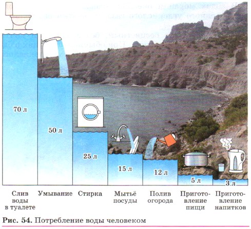 Почти все химические реакции в живой клетке протекают в водных растворах. Большинство реакций, используемых в технологических процессах на предприятиях химической, фармацевтической и пищевой промышленности, происходит также в водных растворах. Без воды невозможно представить жизнь человека, который потребляет её для самых разных бытовых нужд (рис. 54). На вопрос: «Много ли воды на Земле?» — однозначно ответить трудно: и очень много, и очень мало одновременно. Почему много — очевидно: океаны, ледники, реки, дожди... А вот почему мало? Во-первых, потому, что потребности человечества в воде сегодня уже сравнимы с возобновляемыми ресурсами пресной воды на нашей планете. Во-вторых, осуществляя производственные процессы, мы больше загрязняем воду, чем очищаем её. В-третьих, большая часть земной воды — это не просто вода, а концентрированные солевые и иные растворы. В-четвёртых, очень много пресной воды мы расходуем бездумно и напрасно. Поэтому необходимо беречь воду.
