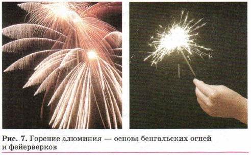 Благодаря лёгкости и прочности алюминий и его сплавы применяют в самолёто- и ракетостроении, недаром алюминий называют «крылатым металлом». Лёгкость и хорошую электропроводность алюминия используют при изготовлении электрических проводов для линий электропередачи (ЛЭП). Теплопроводность и неядовитость важны при изготовлении алюминиевой посуды. Неядовитость и пластичность позволяют широко применять тоненькие листы алюминия — фольгу — в качестве упаковочного материала для шоколадных плиток, чая, маргарина, молока, соков, других продуктов, а также для лекарственных средств, помещённых в контурные ячейки. Внедрение алюминиевых сплавов в строительстве повышает долговечность и надёжность конструкций. Эти примеры иллюстрируют то, что из одного вещества — материала (алюминия) можно изготовить различные физические тела. Алюминий способен гореть ослепительным пламенем (рис. 7), поэтому его используют при проведении красочных фейерверков и изготовлении бенгальских огней (вспомните рассказ Н. Носова «Бенгальские огни»). При горении алюминий превращается в другое вещество — оксид алюминия.