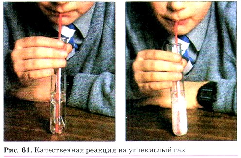 Прозрачный раствор гидроксида кальция называют известковой водой. При пропускании через известковую воду углекислого газа СO2 она мутнеет (рис. 61). Такой опыт служит для распознавания углекислого газа.