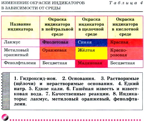 Для щелочей тоже существуют качественные реакции, с помощью которых растворы щелочей можно распознать среди растворов других веществ. Это реакции щелочей с веществами — индикаторами (в пер. с лат. — указатели). Если к раствору щёлочи добавить 1—2 капли раствора индикатора, то он изменит свой цвет. В таблице 4 приведены названия индикаторов и указано изменение их окраски в нейтральной, в щелочной и в кислотной средах. С кислотами — другим классом сложных веществ — вы познакомитесь на следующем уроке.