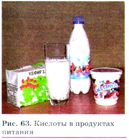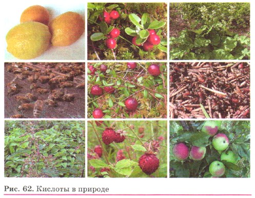 Познакомимся с некоторыми из кислот. В природе встречается много кислот: лимонная кислота в лимонах, яблочная кислота в яблоках, щавелевая кислота в листьях щавеля, муравьиная кислота в пчелином яде и жгучих волосках крапивы (рис. 62). Муравьи защищаются от врагов, разбрызгивая едкие капельки, содержащие муравьиную кислоту. При скисании виноградного сока получается уксусная кислота, а при скисании молока — молочная кислота (рис. 63). Она же образуется при квашении капусты и при силосовании кормов для скота. В быту часто применяют лимонную и уксусную кислоты. Употребляемый в пищу уксус — это раствор уксусной кислоты. Многие кислоты, например серная и соляная, нужны в народном хозяйстве в огромных количествах.