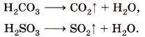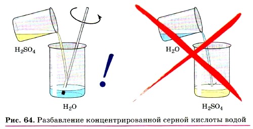 Серная кислота H2SO4 — бесцветная жидкость, вязкая, как масло, не имеющая запаха, почти вдвое тяжелее воды. Серная кислота поглощает влагу из воздуха и других газов. Это свойство серной кислоты используют для осушения некоторых газов. При смешивании серной кислоты с водой выделяется большое количество теплоты. Если воду вливать в серную кислоту, то вода, не успев смешаться с кислотой, может закипеть и выбросить брызги серной кислоты на лицо и руки работающего. Чтобы этого не случилось, при растворении серной кислоты нужно вливать её тонкой струей в воду и перемешивать (рис. 64). Серная кислота обугливает древесину, кожу, ткани. Если в пробирку с серной кислотой опустить лучинку, то происходит химическая реакция — лучинка обугливается. Теперь понятно, как опасно попадание брызг серной кислоты на кожу человека и одежду. Угольная и сернистая кислоты — Н2СO3 и H2SO3 — в свободном виде не существуют, так как они разлагаются на воду и соответствующий оксид (газ):