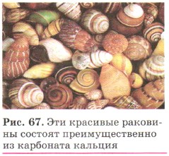 Карбонат кальция СаСO3 — нерастворимая в воде соль, из которой многочисленные морские животные (моллюски, раки, простейшие) строят покровы своего тела — раковины (рис. 67) и кораллы. Остатки коралловых полипов, с которыми вы познакомились на уроках биологии, образуют тропические острова (атоллы) и коралловые рифы (рис. 68). Наиболее известен Большой Барьерный риф в Австралии. Скапливаясь после гибели своих «хозяев» на дне водоёмов и главным образом морей,