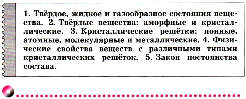 1. В каком агрегатном состоянии будет находиться кислород при - 205 °С? 2. Вспомните произведение А. Беляева «Продавец воздуха» и охарактеризуйте свойства твёрдого кислорода, используя его описание, приведённое в книге. 3. К какому типу веществ (кристаллические или аморфные) относятся пластмассы? Какие свойства пластмасс лежат в основе их промышленного применения? 4. К какому типу относится кристаллическая решетка алмаза? Перечислите характерные для алмаза физические свойства. 5. К какому типу относится кристаллическая решетка иода? Перечислите характерные для иода физические свойства. 6. Почему температура плавления металлов изменяется в очень широких пределах? Для подготовки ответа на этот вопрос используйте дополнительную литературу. 7. Почему изделие из кремния при ударе раскалывается на кусочки, а изделие из свинца только расплющивается? В каком из указанных случаев происходит разрушение химической связи, а в каком — нет? Почему? <<< К началу Ответы к § 23 >>>