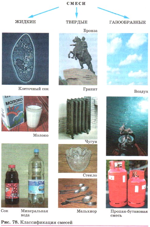 Глава третья. Соединения химических элементов § 24. Чистые вещества и смесиПопробуйте ответить на следующий вопрос: «Можно ли изучать свойства воды, используя для этой цели морскую воду?» Конечно же нет, ибо морская вода представляет собой не чистую Н2O, а смесь различных веществ в ней, и в первую очередь солей (основную массу их составляет хлорид натрия), которые придают морской воде своеобразный горько-солёный вкус. Каждое вещество, выделенное из морской воды, имеет определённые свойства. Да и сама вода, не загрязнённая посторонними примесями или содержащая их чрезвычайно мало, — её называют дистиллированной водой — характеризуется рядом специфических свойств, с которыми вы знакомились раньше, когда рассматривали оксиды. Например, она замерзает при температуре 0°С, тогда как океанская вода — при температуре - 1,9 °С. Природная вода не бывает совершенно чистой. Наиболее чистой является дождевая вода, но и она содержит значительные количества различных примесей, которые захватывает из воздуха. В жизни, как правило, мы встречаемся не с чистыми веществами, а со смесями веществ. Эти смеси могут быть неоднородными (например, мутная речная вода содержит в себе нерастворимые частицы песка и глины, которые видны невооружённым глазом) и однородными (растворы спирта, сахара), в которых нельзя заметить границу раздела между веществами. Среди смесей можно также выделить жидкие, твёрдые и газообразные (рис. 78). Важнейшая газообразная смесь — воздух — представляет собой смесь азота, кислорода, углекислого газа, аргона и других веществ. К твёрдым смесям можно отнести стекло и различные сплавы — сталь, бронзу, латунь и др.