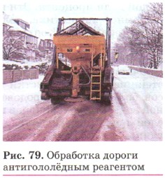 Состав смесей может быть самым разнообразным, и они, в отличие от чистых веществ, имеют другие свойства. Так, чистая вода замерзает при 0°С, а если растворить в ней поваренную соль, то можно добиться значительного понижения температуры замерзания. Этим, например, пользуются работники городского коммунального хозяйства, когда в период гололедицы посыпают тротуары технической поваренной солью или другими реагентами (рис. 79).