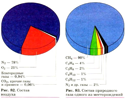 Глава третья. Соединения химических элементов Массовая и объёмная доли компонентов смесиТак, объёмный состав воздуха отражён на диаграмме (рис. 82). Состав природного газа одного из месторождений представлен на диаграмме (рис. 83).