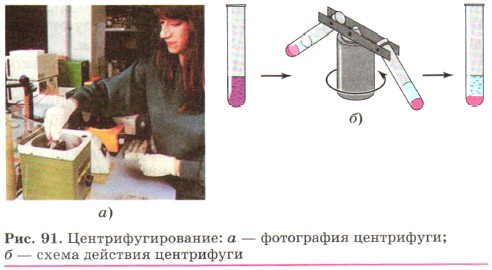 Включают прибор, который начинает, подобно карусели, интенсивно раскручивать закреплённые в нём пробирки. Под действием центробежной силы частицы разных веществ получают различное ускорение, так как обладают различной плотностью, и смесь разделяется (рис. 91).