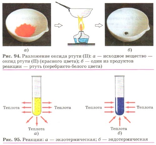К последним, например, относят реакцию разложения оксида ртути (II), которую вы можете посмотреть на фотографиях (рис. 94), так как из-за токсичности ртути и её соединений эту реакцию в условиях школы проводить запрещено. Схематично экзотермические и эндотермические реакции представлены на рисунке 95. В заключение рассмотрим, какие условия должны выполняться, чтобы произошла химическая реакция. 1. Необходимо, чтобы реагирующие вещества соприкоснулись, и чем больше площадь их соприкосновения, тем быстрее идёт химическая реакция. Поэтому твёрдые вещества измельчают и перемешивают, а хорошо растворимые вещества растворяют и растворы сливают. 2. Второе важное условие — нагревание. Некоторые реакции (как правило, экзотермические) идут без нагревания, и только для некоторых экзотермических реакций оно необходимо лишь для того, чтобы реакция началась, а вот для эндотермических реакций необходимо нагревание на протяжении всей реакции. 3. Некоторые реакции протекают под действием электрического тока,света и т. д.