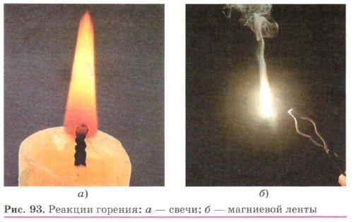 Реакцию мгновенного горения порошка магния использовали при фотографировании в качестве «вспышки», пока не появилась электрическая лампа. Реакции горения — это частный случай большой группы химических реакций, протекающих с выделением теплоты (рис. 93).