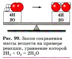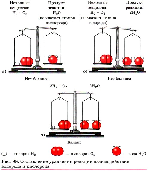 Но теперь в правой части уравнения стало четыре атома водорода, а в левой их осталось два. Чтобы уравнять число атомов водорода, запишем перед его формулой в левой части коэффициент 2. Так как мы уравняли число атомов каждого элемента в левой и правой частях уравнения, заменим стрелку на знак равенства: 2Н2 + O2 = 2Н2O (рис. 98, в). Теперь, наверное, вам понятно, почему такую запись называют уравнением (рис. 99).