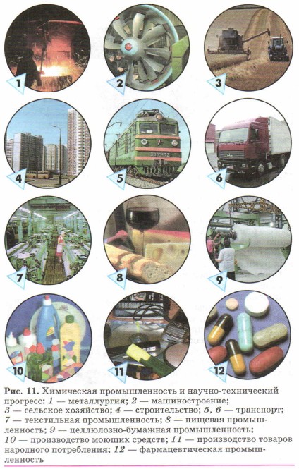 Химическая промышленность развивается в настоящее время гораздо быстрее, чем любая другая, и в наибольшей степени определяет научно-технический прогресс (рис. 11). Как никогда по-современному звучат слова великого русского учёного М. В. Ломоносова, сказанные им ещё в XVIII в.: «Широко распростирает химия руки свои в дела человеческие...» Однако производство таких нужных человеку продуктов химической промышленности, как металы, пластмассы, серная кислота, сода, аммиак, этилен, нефтепродукты и многие другие, сопровождается загрязнением окружающей среды различными вредными веществами. Источниками такого загрязнения являются прежде всего тепловые электростанции, предприятия чёрной и цветной металлургии, химической и горнодобывающей промышленности,