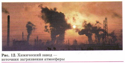 заводы для сжигания мусора, автомобильный транспорт. Они выбрасывают в воздушный океан — атмосферу, которая не знает государственных границ, — опасные для жизни и здоровья людей, животных и растений вещества: оксиды углерода, азота и серы, соединения металлов, хлора, различную пыль и др. (рис. 12). Над крупными промышленными городами висит густой смог. Образующиеся в атмосфере кислотные дожди разрушают скульптуры (рис. 13, а) и дома, медленно убивают растения (рис. 13, б).